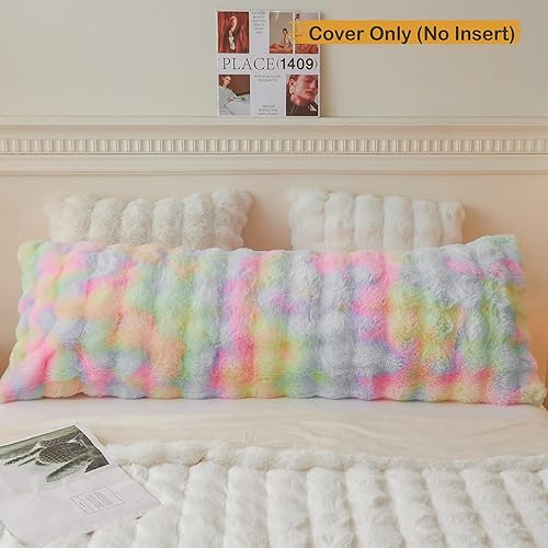 LIFEREVO Fluffy Faux Rabbit Fur Body Pillow Cover, Luxury Ivory Bubble Shaggy Plush Bed Body Pillowcase with Zipper Closure, Long 20"x54" Fuzzy Furry Pillow Case for Adults Kids Girls Teens, Beige(Rainbow,54" x 20" (Pack of 1))