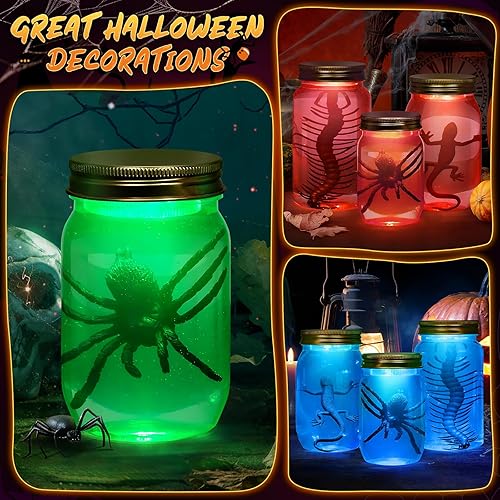 Halloween DIY Specimen jar Set: This Specimen jar contains 3 sizes of bottles (with lids), 2 spiders, 2 centipedes, 2 geckos, 1 set of paint(5 colors), 3 adhesive stickers by 3M, 3 LED lights, and 1 remote control. Rich accessories will meet your DIY needs and create Halloween in various styles. It is a great addition to Halloween party gifts, Halloween-themed crafts, and mad scientist laboratory decorations.