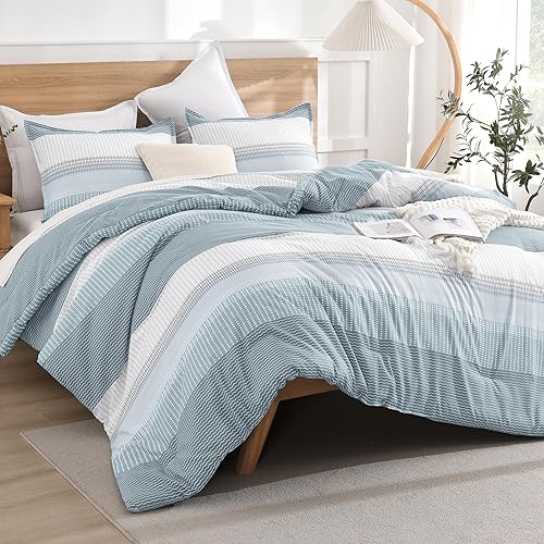 [ PACKAGE INCLUDES ] Queen Size Down Alternative Comforter Set: 1 stripe comforter queen (90x90 inches) with corner loops (can be fixed with your duvet cover), 2 envelope pillowcases (20x26 inches). Vacuum packaging. *Due to manual cutting, pattern of pillow sham is random. The pillow insert is not included.