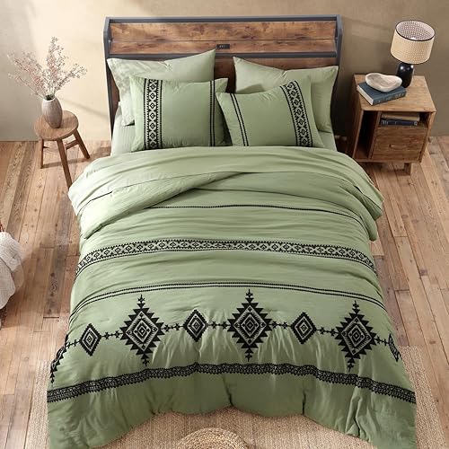 MaiRêve Burnt Orange Embroidery Comforters Set Queen Size - 7 Pieces, Farmhouse Western Bedding All Season, Bed in A Bag Queen Boho Comforter Set with Sheets, Pillowcases & Shams(Light Olive Green,Full 7 Piece)