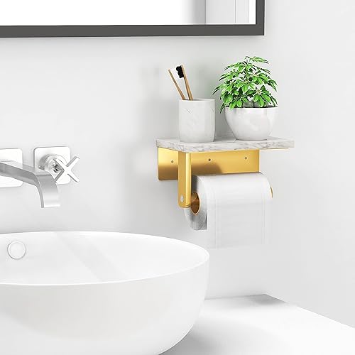 Marble Toilet Paper Holder with Shelf, 304 Stainless Steel Screw Wall Mounted, Tissue Roll Holder for Bathroom Washroom Matte Black(Gold)