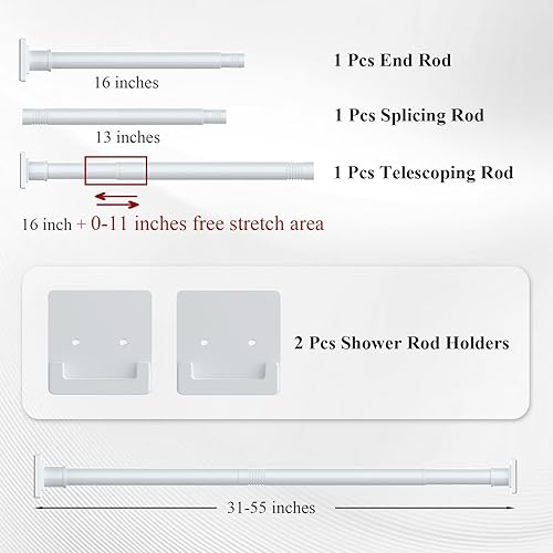 Matte Black Shower Curtain Rod 31-79 inches with Holders, Stainless Steel Shower Rod & Tension Rod, Adjustable Tension Shower Curtain Rod for Bathroom, Windows, Closet(White,31"-55")