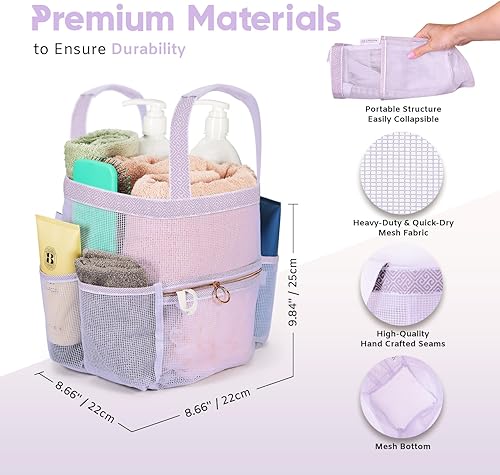 VERSATILE - With this mesh tote everything you need is easily accessible, organized and tidy. The shower caddy bag and the pocket are equipped with zippers to prevent your toiletries from falling out. The shower caddy tote is a simple yet essential item that always keeps all your bathroom accessories within easy reach when you're in the shower or bathroom.