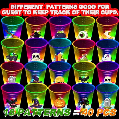 Glow Halloween Party Cups: 40 Halloween themed 16oz cups, 40 flashing LED lights, 40 waterproof stickers.