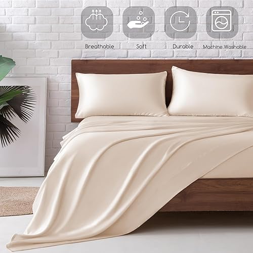 MR&HM Satin Bed Sheets, Queen Size Sheets Set, 4 Pcs Silky Bedding Set with Elastic Corner Straps and 15 Inches Deep Pocket for Mattress (Queen, Black)(12- Beige,Queen)