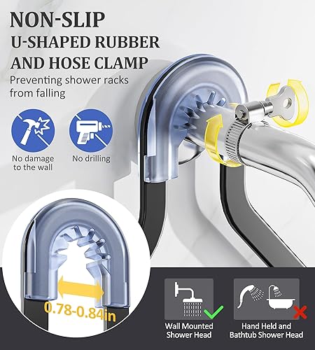 Safe and Sturdy: The hanging shower caddy fits most shower heads. A non-slip U-shaped rubber ring above the shower head and an exclusive adjustable hose clamp provide double safety protection to prevent the whole shower caddy from falling
