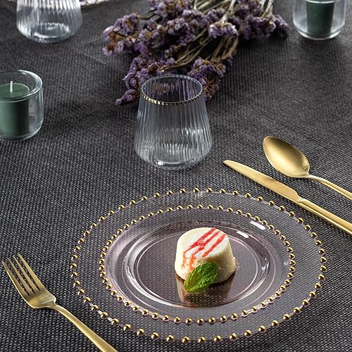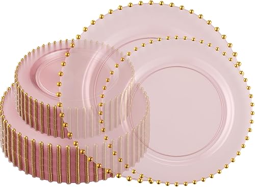PLASTICPRO 32 Piece Combo Plastic Dinner Plates Disposable Plastic Fancy Heavy Duty Party Dishes 7 inch and 10 inch, White Beaded(128,Translucen Pink & Gold Beaded Collection)