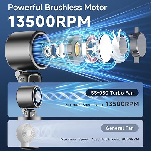 【11000 RPM Turbo Fan, 3X Faster Cooling in Seconds】Equipped with a high-speed three-phase brushless motor and advanced 6-blade turbo design, this fan delivers an unrivaled 10m/s maximum wind speed—3 times faster than ordinary handheld fans. The 11000 RPM rotational speed creates a powerful air stream that cuts through hot air instantly, making it ideal for sweltering commutes, outdoor sports, or crowded indoor spaces