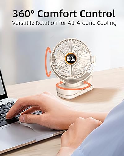 Portable Mini Personal Fan, Small Rechargeable Battery Powered Stroller Fan for Desk, Strong Clamp Grip, 360° Rotation, 3-Speed, LED Display, Clip On Cooler for Bed, Golf Cart, Office, Blue(Beige)