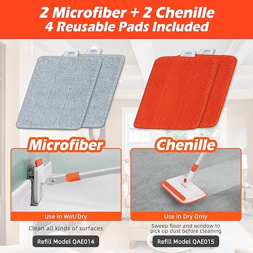 【Replaceable and Machine-washable】Mop pads are available. The microfiber replacement head model is designated QAE014; the chenille pad model is designated QAE015