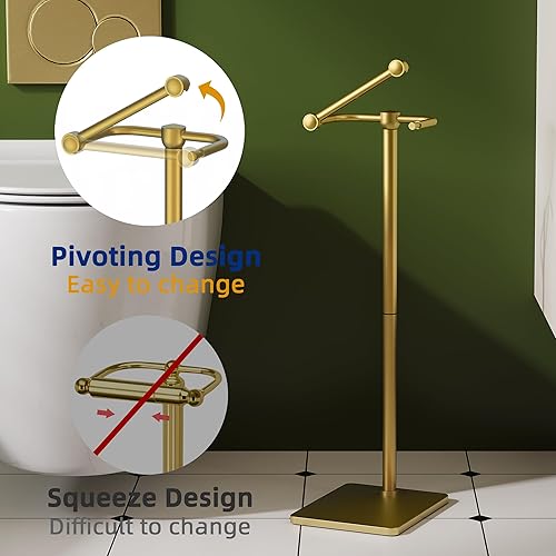 Ruacq Toilet Paper Holder Matte Black Double Post Pivoting Square Tissue Holders Roll Holder Hangers Toilet Paper Modern Wall Mounted, Commercial Bathroom Toilet Paper Roll Holder(Brushed Gold,Free Standing)