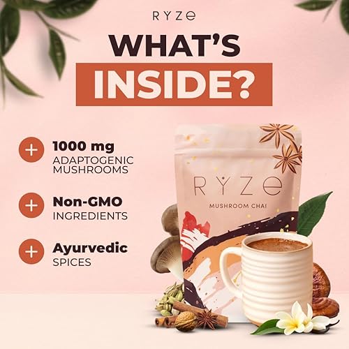 RYZE SUPERFOODS Mushroom Chai with 6 Organic Adaptogenic Mushrooms for Better Energy, Focus, Digestion, Immunity with USA Grown Lion's Mane, Turkey Tail, Shiitake, Reishi - Gluten Free, 20 Servings
