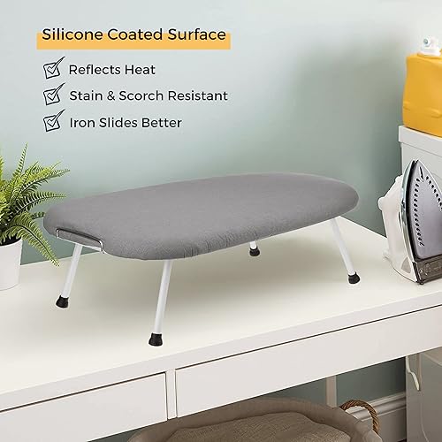 4 LAYERS SILICONE COATING PURE COTTON THICK PADDING: Tabletop ironing cover silicon coated layer is extremely heat reflective scorch and stain resistant for fast ironing. Iron table cloth stain assistance pure cotton layer, thicker foam padding and extra durable heat resistant and professional ironing board cover non slip felt layer for unique ironing experience.