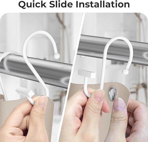 Quick installation & no risk of falling: Tool-free installation involves threading the shower rings through the curtain onto the rod. The ball head prevents slipping off the rod, while the T-bar stops the curtain from falling off the rings.