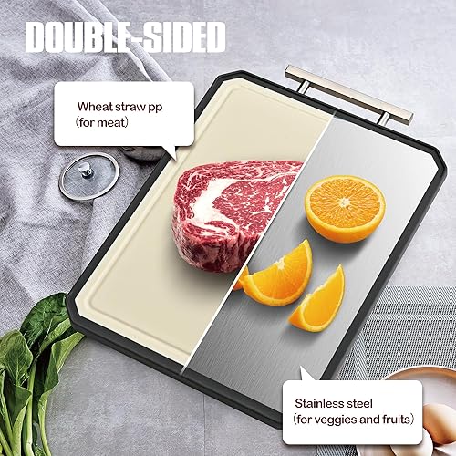 【DESIGNED FOR YOUR KITCHEN】This large meat cutting boards for kitchen is made of stainless steel (for meat)and wheat straw pp(for veggies and fruits), making it sturdy and durable for use in your kitchen.