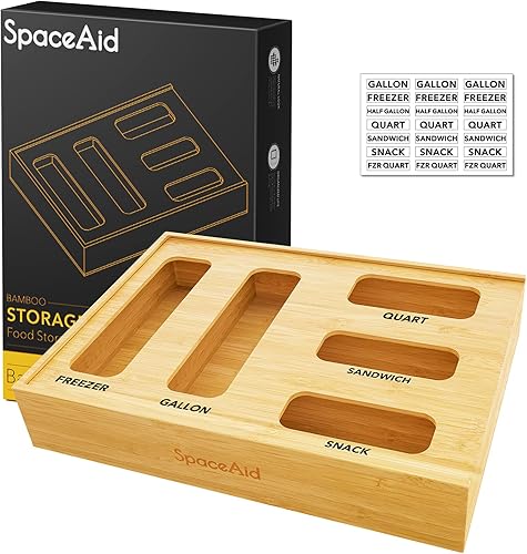 SpaceAid Bag Storage Organizer for Kitchen Drawer, Bamboo Organizer, Compatible with Gallon, Quart, Sandwich and Snack Variety Size Bag (1 Box 4 Slots)(Natural- 3"H- 5 Slots)