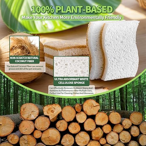• 【All Natural plant based sponges】Made by 100% natural sustainable plant-based white natural cellulose sponge and coconut fiber embedded scouring pad,make sure the kitchen sponge is easy to dry,They are remarkably durable and resistant to tearing and wear,At the end of its use,making them 100% biodegradable and compostable,Make your kitchen, home, the earth has become green environmental protection! Give you a healthier lifestyle!And the packaging box is also 100% environmentally friendly, recyclable and reusable, which can be used as fertilizer for household planting of flowers, plants and trees