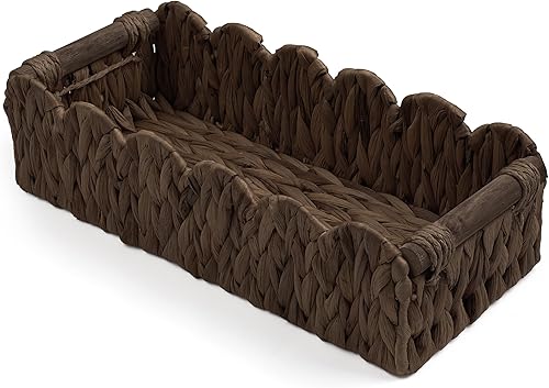 Scalloped Edge Design: Featuring innovative curved detailing, this storage basket is elevated by handcrafted wooden handles that create eye-catching fluidity. The organic aesthetic effortlessly transitions between bathroom essentials organizer and chic living room accent piece.