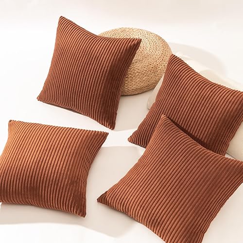 Topfinel Fall Burnt Orange Decorative Throw Pillows Covers 18x18 Inch Set of 4,Yellow Green Gradient Series Corduroy Striped Square Pillow Case,Western Modern Cushion Cover for Couch Sofa Bedroom(Terracotta,16" x 16" (Pack of 4))