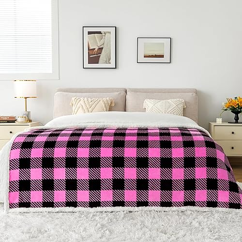 Touchat Sherpa Red and Black Buffalo Plaid Christmas Twin Blanket 60" X 70", Fuzzy Fluffy Soft Cozy Throw Blanket, Fleece Flannel Plush Microfiber Blanket for Couch Bed Sofa(Rosepink)