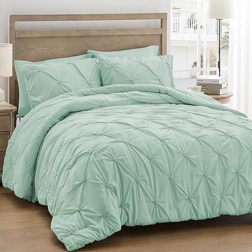 UNIKOME Queen Comforter Set White - WarmSoft Pintuck Down Alternative Bedding Set for Winter, All Seasons, 3 Pieces Pinch Pleat Solid Bed Set with Comforter, 2 Pillowcases(11 Sage Green,King(104"x92"))
