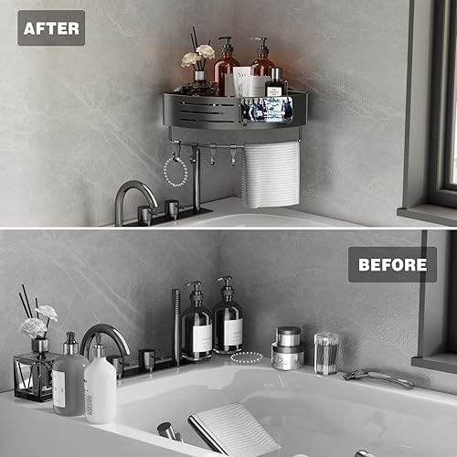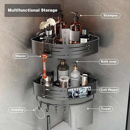 【Multi-function & Large Capacity】The single-layer size of this corner shower organizer is 8.86 "*8.86 "*2.6 ". The package includes two suction cup baskets and four detachable hooks, a towel bar and multiple plastic hooks, which can place shampoo, conditioner, shower gel, facial cleanser, towels, and other daily necessities; multiple hooks can be used to hang razors, phones, bath brushes, bath balls, etc., fully improving the utilization of vertical space. Whether it is the bathroom, kitchen, or RV, it can be flexibly deployed to enjoy a neat and convenient experience.