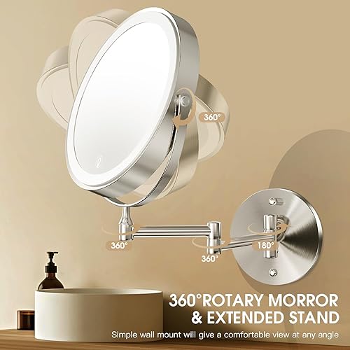 360° Rotatable & Extendable Arm Makeup Mirror: As you see in a hotel bathroom, our wall-mounted mirrors can be rotated 360°, so you can adjust it to the angle you want and switch between the 1x and 10x mirrors. The flexible mirror arm allows you to adjust the led magnifying mirror for bathroom to the right viewing. You can see so much better then trying to lean over the sink or bending over. You can fold the mirror on the wall to save space when you are not using it.