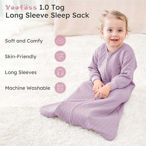 Yoofoss Baby Sleep Sack 6-12 Months 1.0 Tog Long Sleeve Sleep Sack Organic Cotton Wearable Blanket for Infants 2-Way Zipper Quilted Sleeping Sacks(Medium)(Purple,0-6 Months)