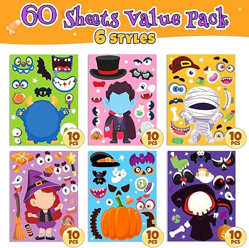 60 PCS Fun Halloween Sticker Set : This set includes 6 styles—mummies, pumpkins, vampires, little monsters, and grim reapers death—10 stickers per style. Each sticker has unique eye, mouth, and eyebrow designs, there are at least two face options with several different decorations on every sheet, enough to meet your Halloween decoration needs. Extra face stickers can also decorate pumpkins or other items, perfect for sprucing up Halloween settings and creating a fun Halloween time.