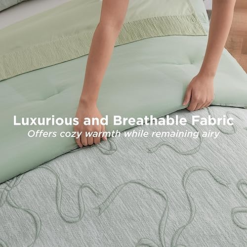 Bedsure Queen Comforter Set, Pink Boho Tufted Bed Set, 3D Puffy Jacquard Bedding Queen Size, 3 Pieces, 1 Farmhouse Shabby Chic Embroidery Comforter with Bow Pattern & 2 Pillow Cases(07 - Sage Green - Bow,Full)