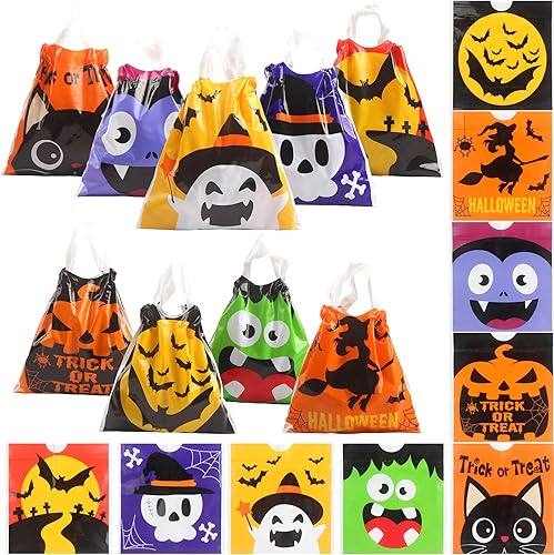 DOUBLE SIDE PRINTED 9 PATTERNS:There are 9 different popular patterns printed: skull, monster, bat, witch, pumpkin, ghost, cat in vivid colors,Perfect for Halloween Parties, Trick-or-Treating, Goodies Bags, Candy Bags, Snack Bags, Halloween Party Favors, School, Kindergarten and Classroom Prizes