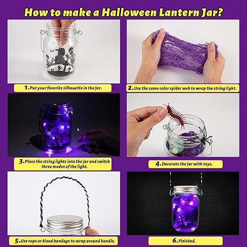 Tons of Fun in One Package-Unleash your spooky creativity with our all-inclusive Halloween Lantern Jar Kit! This ultimate DIY package contains everything you need: 4 glass mason jars, 8 versatile LED light strips (1 per jar + 4 backup strips), and a thrilling assortment of spooky accessories like glow-in-the-dark eyeballs, bugs, spiders, spider webs, and other glow surprises. Design, craft, and light up your unique Halloween vision.