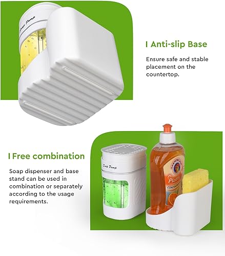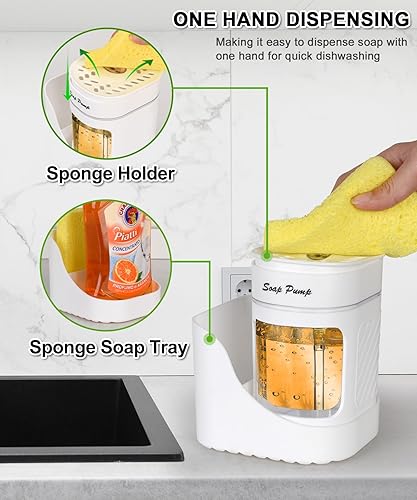 LARGE CAPACITY & EASY DISPENSING: Sponge soap dispenser only needs to gently press down with one hand to dispense an appropriate amount of soap onto the sponge, extremely easy to use and helps reduce soap wasted. The dish soap dispenser has a capacity of 14.5 ounces so that you don't need to refill it frequently, And suitable for all kinds of liquid soap.